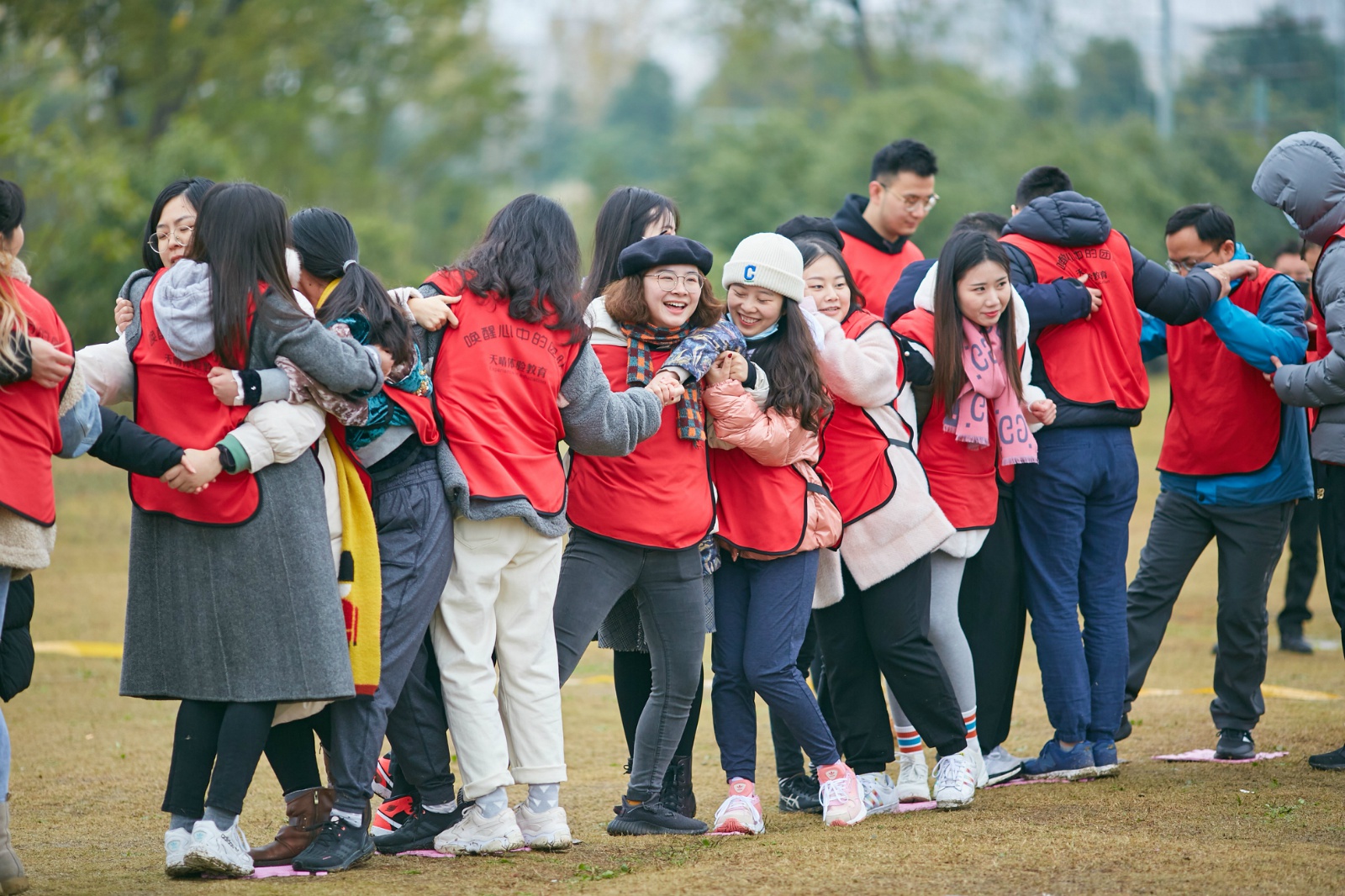在初步构建彼此信任基础上,在心理和体能得到充分准备后,8支队伍分为两组进行团队竞赛大比拼。竞赛中,无论是“跨越沼泽”还是“旱地龙舟”,都展现出团队间彼此信任、相互帮助。在合作中,有的同学主动站出来指挥队员分工协作;有的同学思路清晰,积极支招;有的同学活泼开朗,负责气氛带动,加油号子喊得十分响亮。一番激烈的竞技比赛后,同学们的默契度和信任感得到增强。最后,近400名同学再次汇聚一起,共同拾起两圈坚实的长绳,手牵手、肩并肩组成人墙,开始了体力与毅力的终极考验项目——众人划桨士气高。活动中,所有人需用力紧绷身前长绳,8名队长站在绳上环绕一圈扮演“船长”角色,伴着激昂的音乐和长绳“海浪”,“船长”要在绳子上前行。此项团队合作活动,即锻炼胆识,又熔炼团队精神。