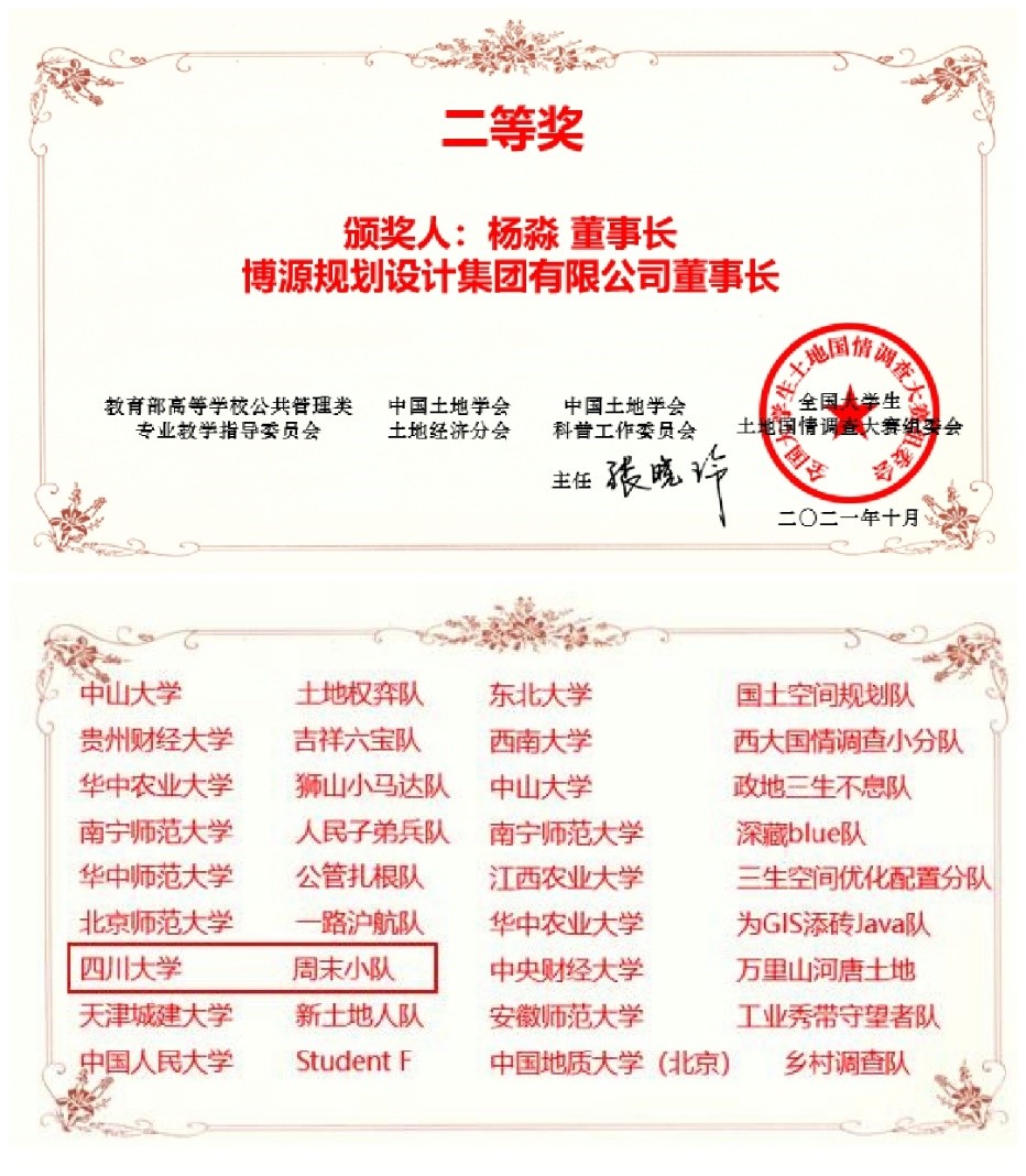 土含国运,管奉民生。新时代、新机遇发展背景下,国土空间优化和区域经济协调的重要性不言而喻。参赛过程中,各参赛小组收获颇丰,通过实地调研将课内知识进行成果转化,培养了严谨的学术思维能力。同学们团结一致、互相激励,也很好地展现了团队合作精神和川大学子扎实的理论基础和突出的实践能力。